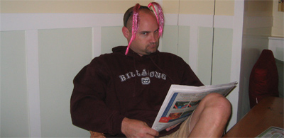Beq, Jim, Jaxon & Wyatt crashed at our place after Jen's party. In the morning -- pancakes, badminton and some backyard baby cuddling.