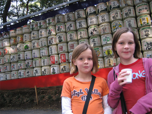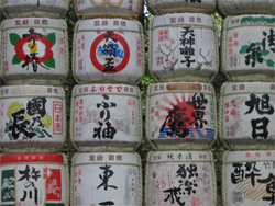 Second row: barrels of sake offered to the shrine.