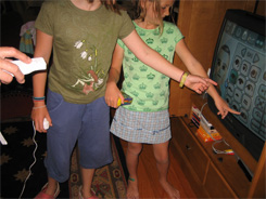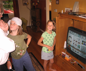 A Wii for Mii!June 10, 2007Hey, that ain't soap-on-a-rope! Great Father's Day gift: the hard-to-find Nintendo Wii! Jen called all around for weeks, and when she found a nearby Walmart with Wii's in stock, she and Ellie jumped in the car and raced up to get one for me before they flew off the shelves. We finally broke our inertia-based moratorium on video games, but this one seems pretty different. I first played it in the Chicago office, and after 15 minutes boxing with a consultant, my shirt was sticky. Here are the girls helping my dad make his Mii. |